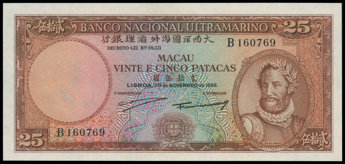 Banco Nacional Ultramarino, 25 patacas, 1958, serial number B160769, brown on multicolour underprint, Camoes at right, watermark at left, arms at centre bottom, reverse brown, ship seal at left,