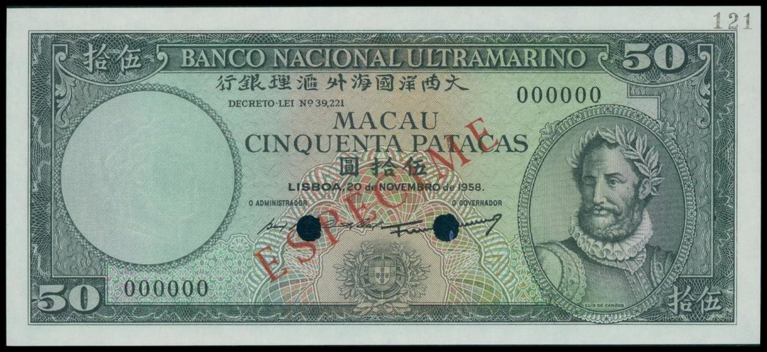 Banco Nacional Ultramarino, 50 patacas, 1958, specimen, black serial number 000000, control number 121, dark green on multicolour underprint, Camoes at right, watermark at left, arms at centre bottom, reverse dark green and pink, ship seal at left, red 'Specimen' overprinted on both side,