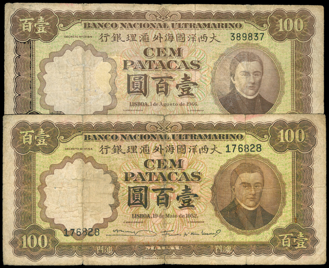 Banco Nacional Ultramarino, a pair of 100 patacas, 1952 and 1966, serial number 176828 and 389837, similar design, brown on light green and multicolour underprint, Silveira at right, reverse brown, pink and light green, arch at centre,