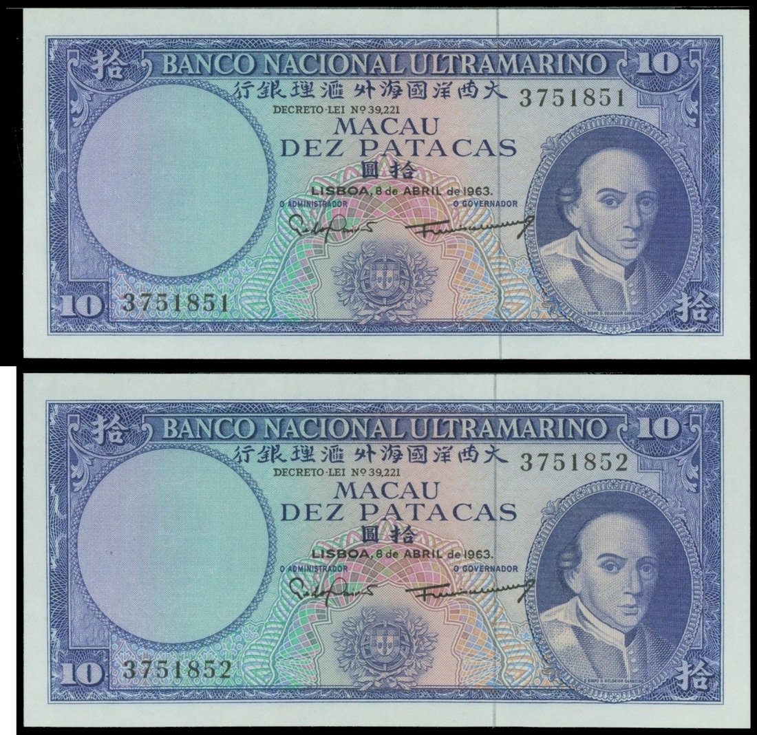 Macau, Banco Nacional Ultramarino, pair of 10 patacas, 1963, serial number 3751851 and 3751852, blue on multicolour, Carneiro at right, reverse blue and pink, maiden watching departing ships, shipi seal at left,