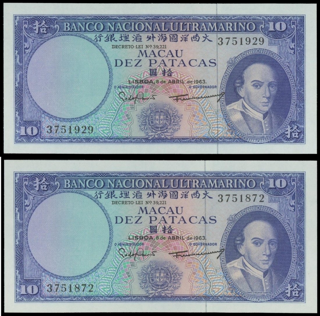 Macau, Banco Nacional Ultramarino, pair of 10 patacas, 1963, serial number 3751872 and 3751929, blue on multicolour, Carneiro at right, reverse blue and pink, maiden watching departing ships, shipi seal at left,