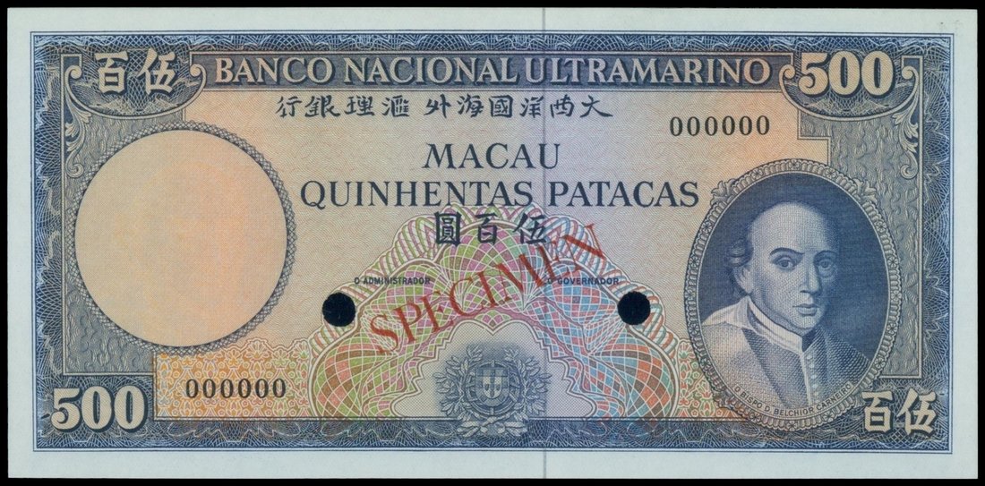 Banco Nacional Ultramarino, 500 patacas 'COLOUR TRIAL SPECIMEN', ND(1963), serial 000000, blue and multicoloured, Carneiro at right, arms low centre, value at centre and at each corner, reverse green and multicoloured, maiden and ships at centre, ship seal at left,