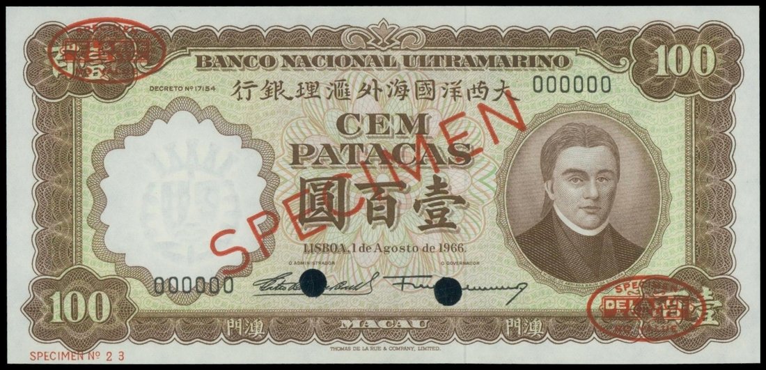 Banco Nacional Ultramarino, specimen 100 patacas, 1 August 1966, serial number 000000, brown and multicoloured, da Silveira at right, reverse brown, gateway at centre, arms at left,
