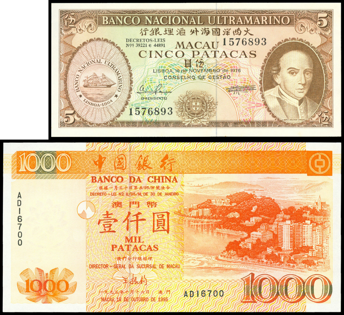 Macau, Banco Nacional Ultramarino, Bank of China, 5 and 1000 patacas, 1976 and 1995, serial number 1576893 and AD16700 respectively, brown on light green underprint and orange on light yellow green underprint respectively,