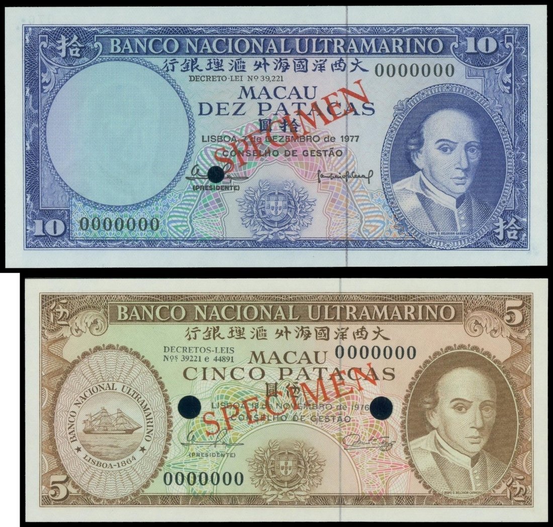 Banco Nacional Ultramarino, a lot of 2 notes, a pair specimen of 5 and 10 patacas, 1976, 1977, brown on multicolour, blue on multicolour, Carneiro at right, arms low centre, red 'SPECIMEN' overprinted at centre, reverse maiden and ships at centre,