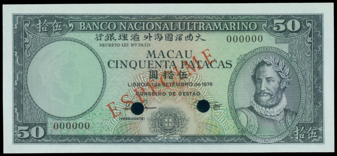 Banco Nacional Ultramarino, specimen 50 patacas, 1976, serial 000000, green on multicolour underprint, Camoes at right, watermark at left, red ‘SPECIMEN’ overprinted at centre, reverse green on multicolour, maiden and ships at centre,