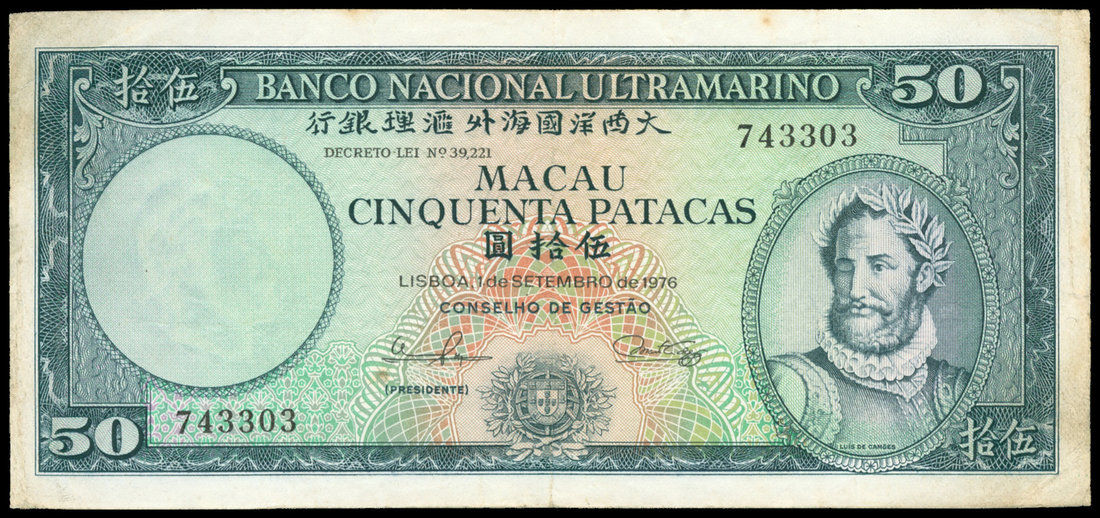 Banco Nacional Ultramarino, 50 patacas, 1976, serial number 743303, grey green on multicolour underprint, Camoes at right, watermark at left, arms at centre bottom, reverse green and pink, ship seal at left,