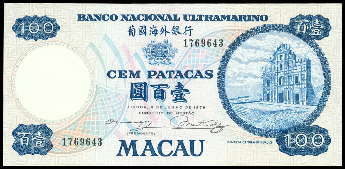 Banco Nacional Ultramarino, 100 patacas, 1979, serial number 1769643, blue on multicolour underprint, Ruinas Da Catedral De S. Paulo at right,arms at top centre, reverse blue , sailing boat at left, ship seal at centre,