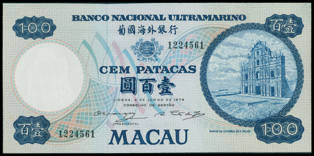 Macau, Banco Nacional Ultramarino, 100 patacas, 8 June 1979, serial number 1224561, blue, arms top centre, the Cathedral of Saint Paul at right, reverse blue, ship seal at centre, junk at left,