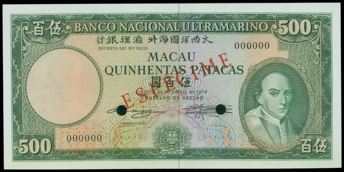 Banco Nacional Ultramarino, specimen 500 patacas, 1979, serial 000000, green on multicolour underprint, Carneiro at right, watermark at left, red ‘ESPECIME’ overprinted at centre, reverse green on multicolour, maiden and ships at centre,