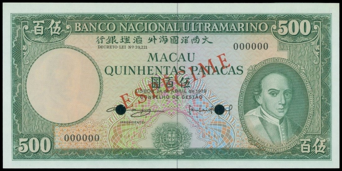 Banco Nacional Ultramarino, specimen 500 patacas, 1979, serial 000000, green on multicolour underprint, Carneiro at right, watermark at left, red ‘ESPECIME’ overprinted at centre, reverse green on multicolour, maiden and ships at centre,