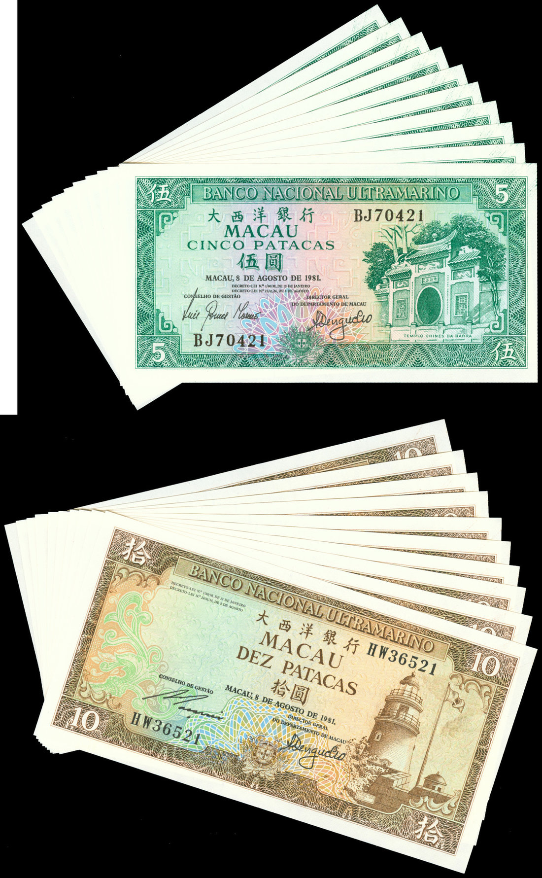 Macau, a group of 20 notes consisting of: 5 patacas, 1981, a consecutive run of 10, serial numbers BJ70421-430 and also 10 patacas, 1981, a consecutive run of 10, serial numbers HW36521-530,