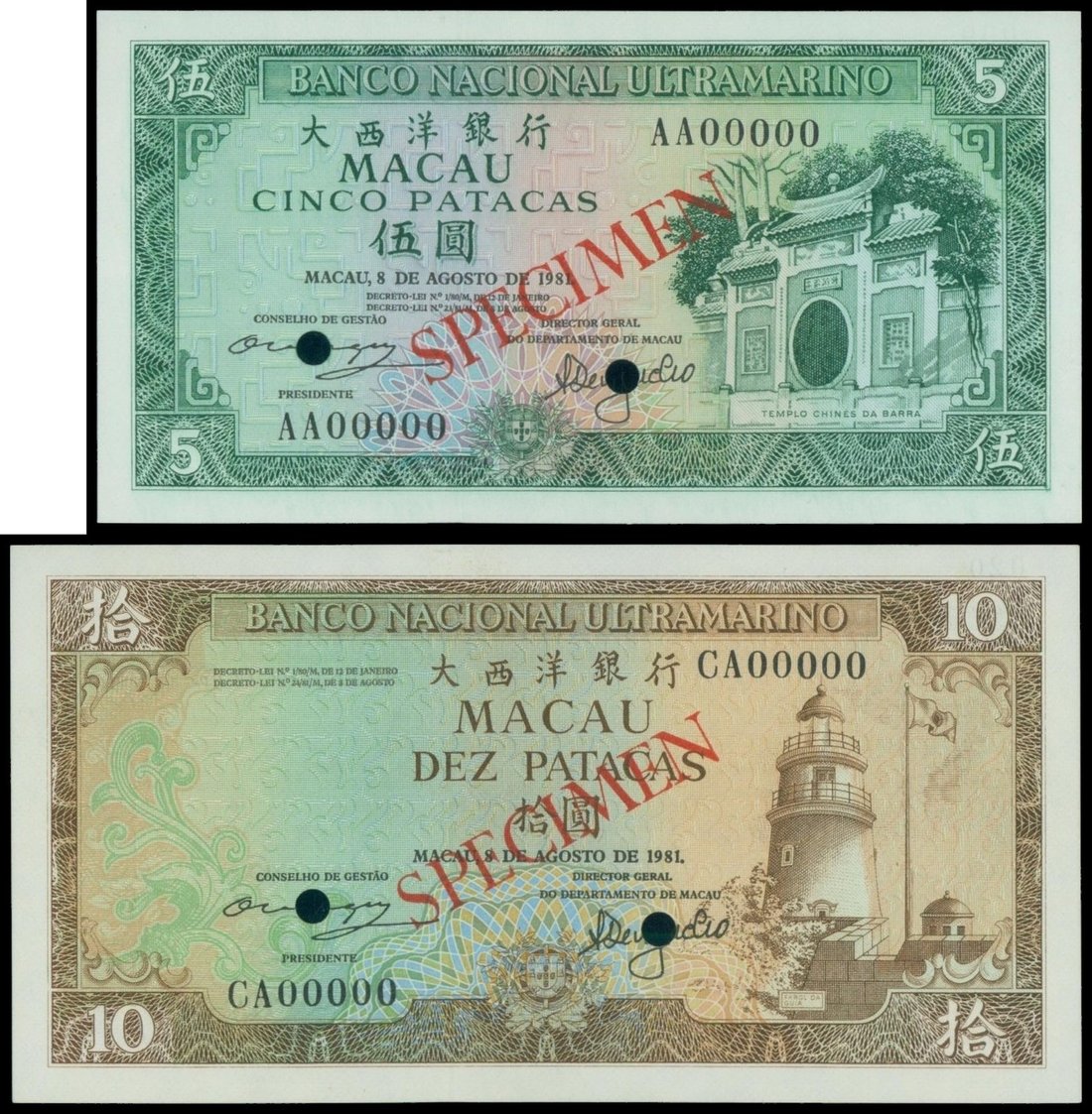 Banco Nacional Ultramarino, a lot of 2 notes, a pair specimen of 5 and 10 patacas, both 1981, green or brown on multicolour, landmarks at right, arms low centre, red 'SPECIMEN' overprinted at centre, reverse view of Baia Da Praia Grande view at centre,