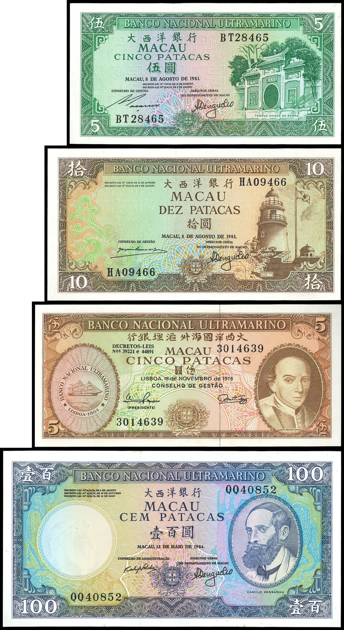 Banco Nacional Ultramarino, Macau, a group of 4 notes, 5 patacas, 1976, serial number 3014639, Carniero at right, 5 and 10 patacas, 1981, green and brown, Temple and Lighthouse respectively, and 100 patacas 1984, serial number QQ40852, blue, Pessanha at right