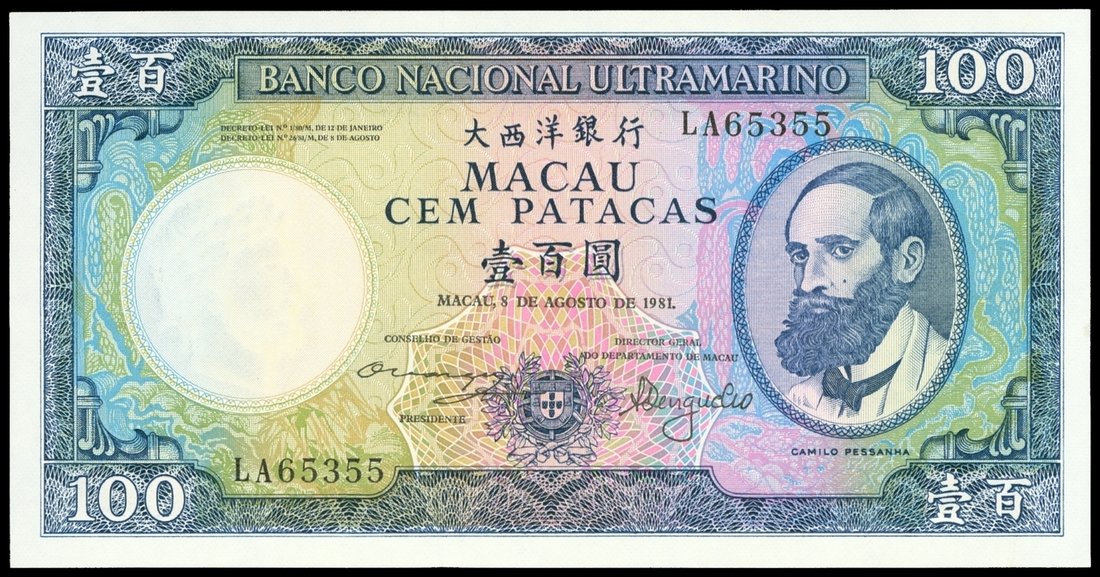 Macau, Banco Nacional Ultramarino, 100 patacas, 8.8.1981, 1st prefix, serial number LA65355, blue and purple, C. Pessanha at right, reverse navy, shows habour secene, also a 20 patacas, 20.12.1999, serial number KL023999,