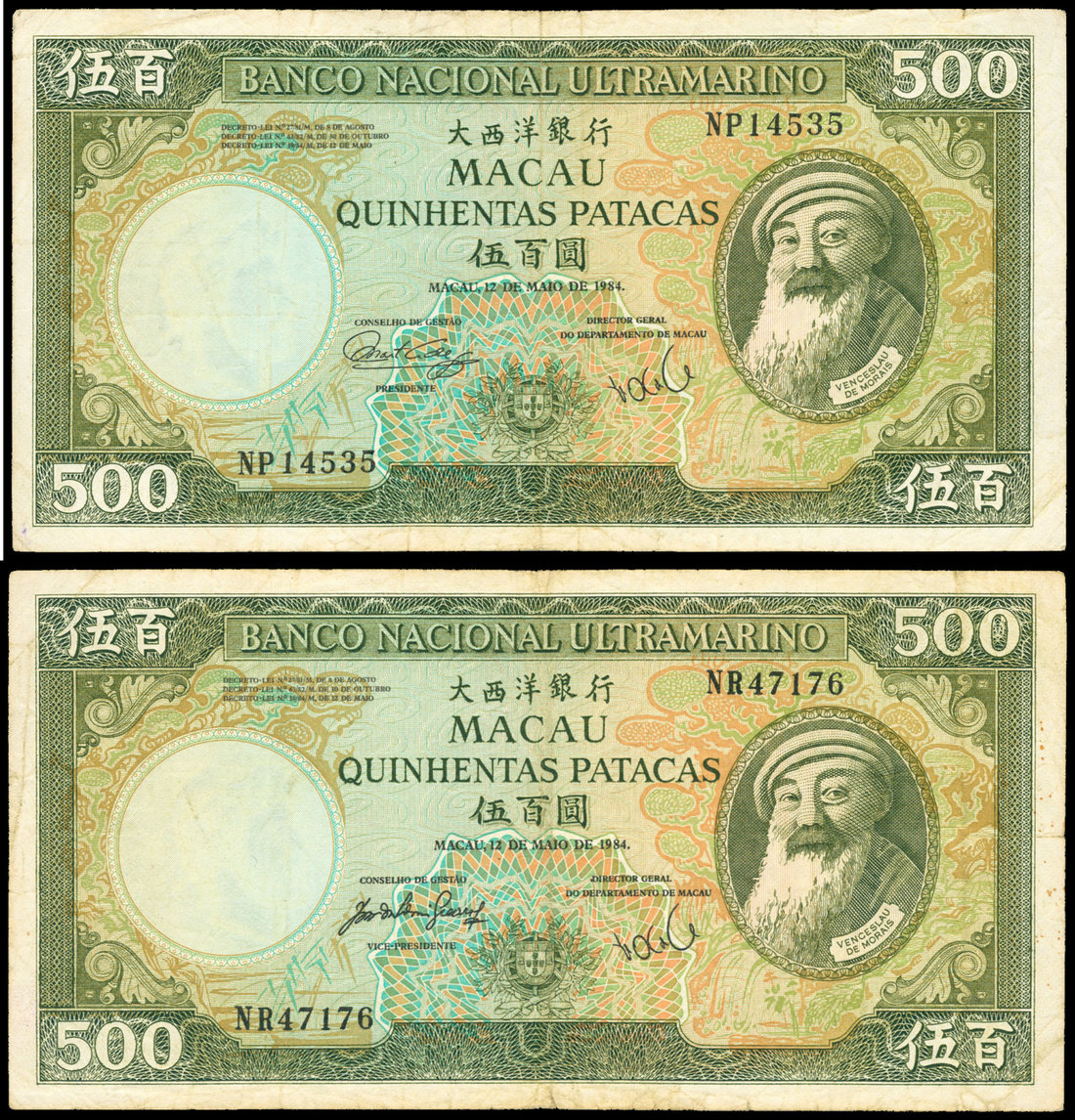 Banco Nacional Ultramarino, a pair of 500 patacas, 1984, serial number NP14535 and NR47176, green on multicolour underprint, Morais at right, arms at bottom centre, reverse green, Baia Da Praia Grande at centre,