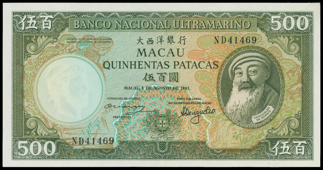 Macau, Banco Nacional Ultramarino, 500 patacas, 1981, serial number ND41469, green and multicoloured, De Morais at right, arms at low centre, reverse green and multicolour, Baia Da Praia Grande at centre, values at corners,