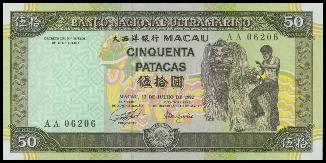 Banco Nacional Ultramarino, 50 patacas, 1992, serial number AA06206, black on light green and multicolour underprint, traditional lion dance at right, reverse black on light green underprint, city view and bridge at centre,