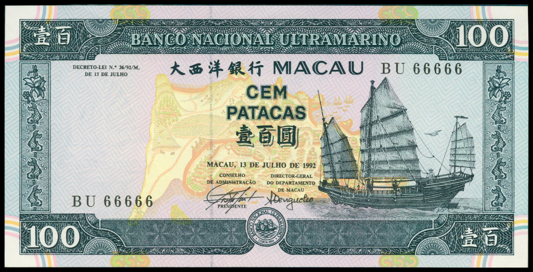 Macau, Banco Nacional Ultramarino, 100 patacas, 1.7.1992, solid number BU 66666 grey-blue on pink and multicolour, sailing junk boat at right, view of modern Macau on reverse,