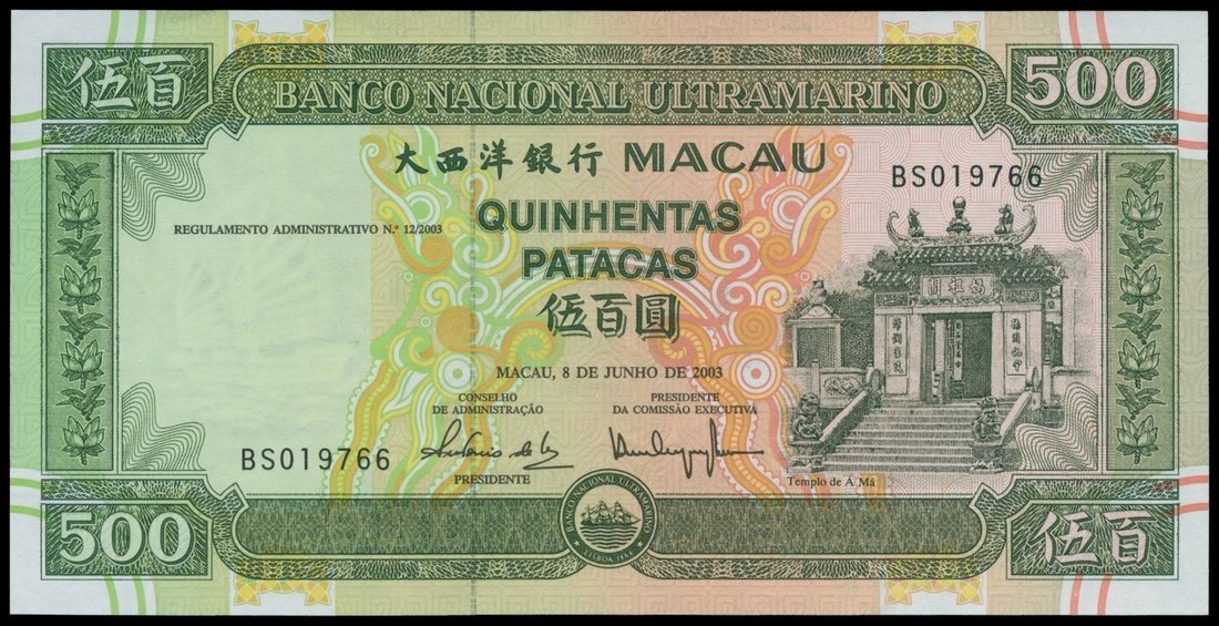 Macau, Banco Nacional Ultramarino, pair of 500 patacas, 8.6.2003, serial number BS019766, olive-greeb and multicolour, temple at right, watermark at left, reverse olive green,