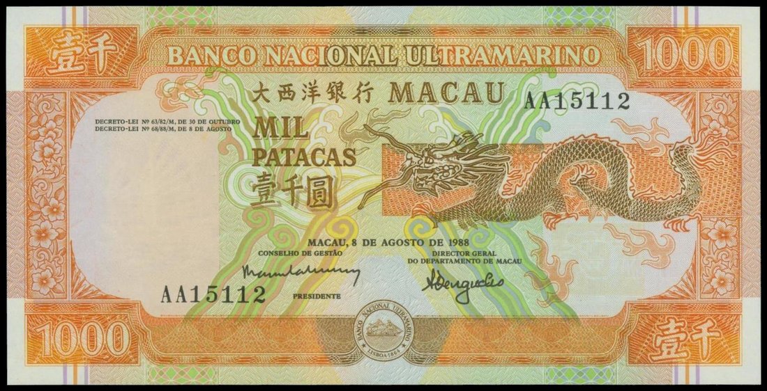 Banco Nacional Ultramarino, 1000 patacas, 1988, serial number AA15112, orange on light green and yellow underprint, dragon at right, watermark of boat at left, reverse orange and multicolour, bridge and buildings at centre left,