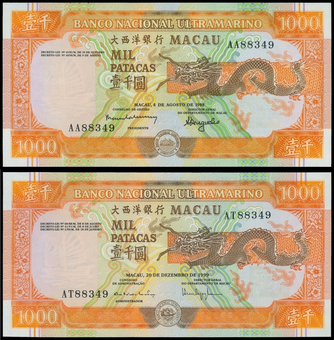 Macau, Banco Nacional Ultramarino, pair of 1000 patacas, 1988 and 1999, different prefix but identical number 88349, orange on light green and yellow underprint, dragon at right, watermark of boat at left, reverse orange and multicolour, bridge and buildings at centre left,