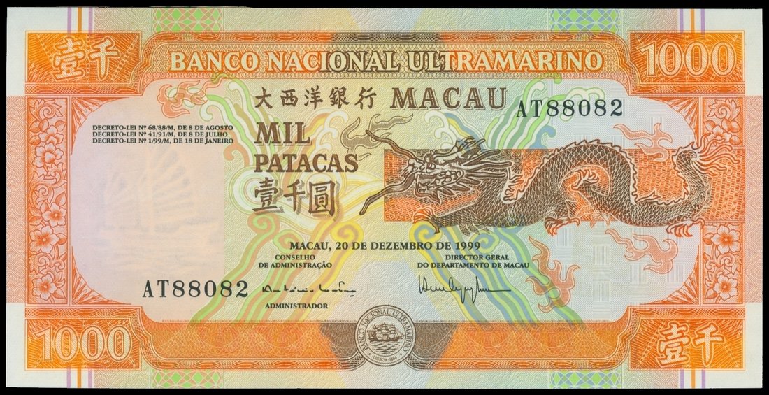 Banco Nacional Ultramarino, 1000 patacas, 1999, serial number AT 88082, orange on light green and yellow underprint, dragon at centre right, bank seal at bottom centre, reverse orange on multicolour underprint, view of bridge and buildings at centre left,