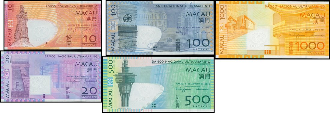 Macau, Banco Nacional Ultramarino, group of 5 notes, 8.8.2005, identical serial number AA082106, 10, 20, 100, 500 and 1000 patacas, red, orange, green, blue and purple,