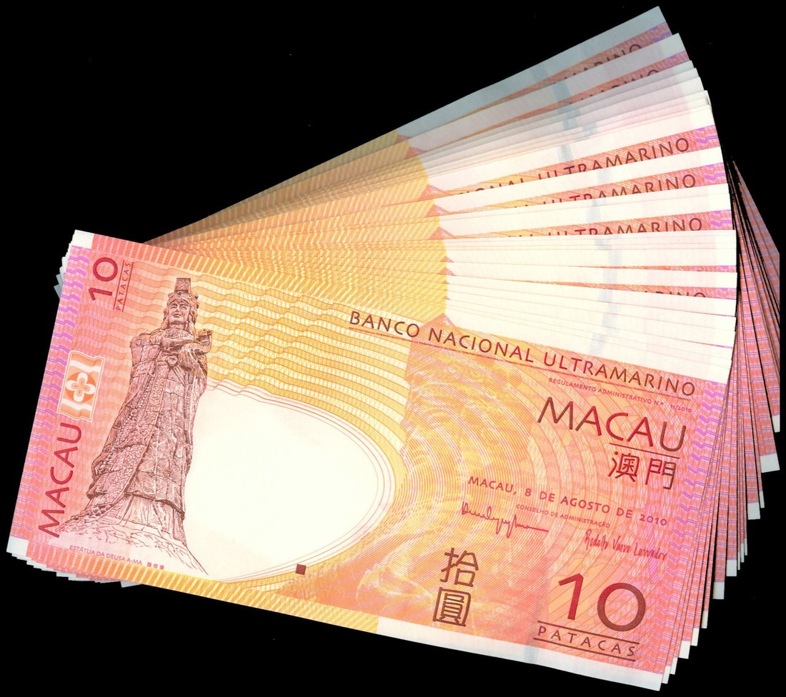 Macau, Banco Nacional Ultramarino, 10 patacas, a mostly consecutive run of 100 notes, 8.8.2010, serial ZZ84xxxx, pink and multicolour underprint, A-ma goddess on obverse, bank on reverse,