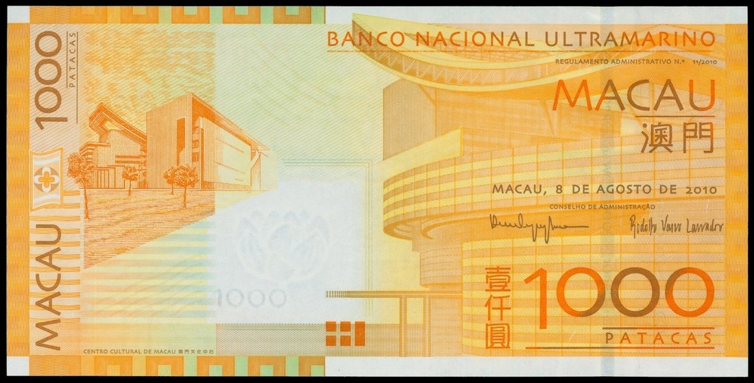 Macau, Banco Nacional Ultramarino, 1000 patacas, 8.8.2010, replacement serial number ZZ038796, yellow orange, on multicolour, modern building at top left,