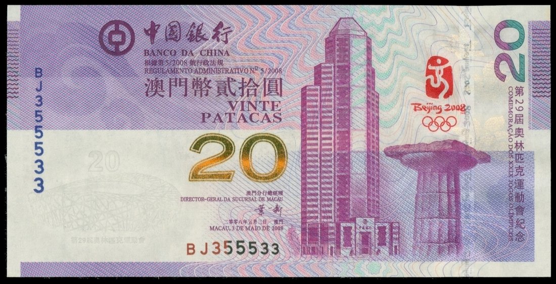 Banco Da China, 20 patacas, Beijing Olympic Commemorative, 2008, serial number BJ355533, purple on multicolour underprint, Bank of China building, Greek column and Beijing Olympic logo at left, reverse shows the Beijing Olympic Stadium at left,