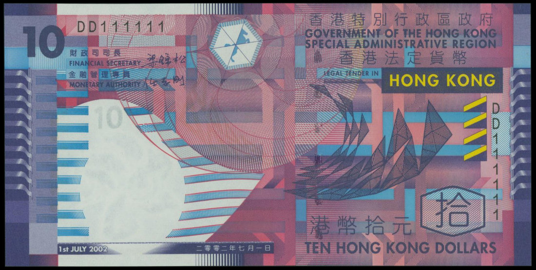 Hong Kong Government, $10, 1.7.2002, solid serial number DD111111, purple on mutlicolour underprint, geometric pattern design,