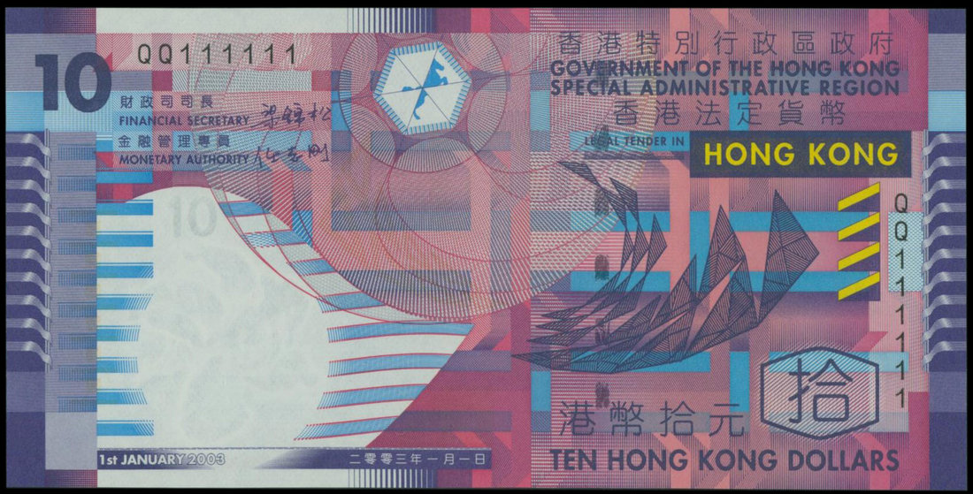 Hong Kong Government, $10, 1.1.2003, solid serial number QQ111111, purple on mutlicolour underprint, geometric pattern design,