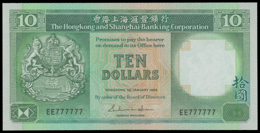 The HongKong and Shanghai Banking Corporation, $10, 1.1.1986, solid serial number, EE777777, green and brown on multicoloured underprint, coat of arms at left, watermark of a lion at right, reverse green, two lions flanking the HSBC building,