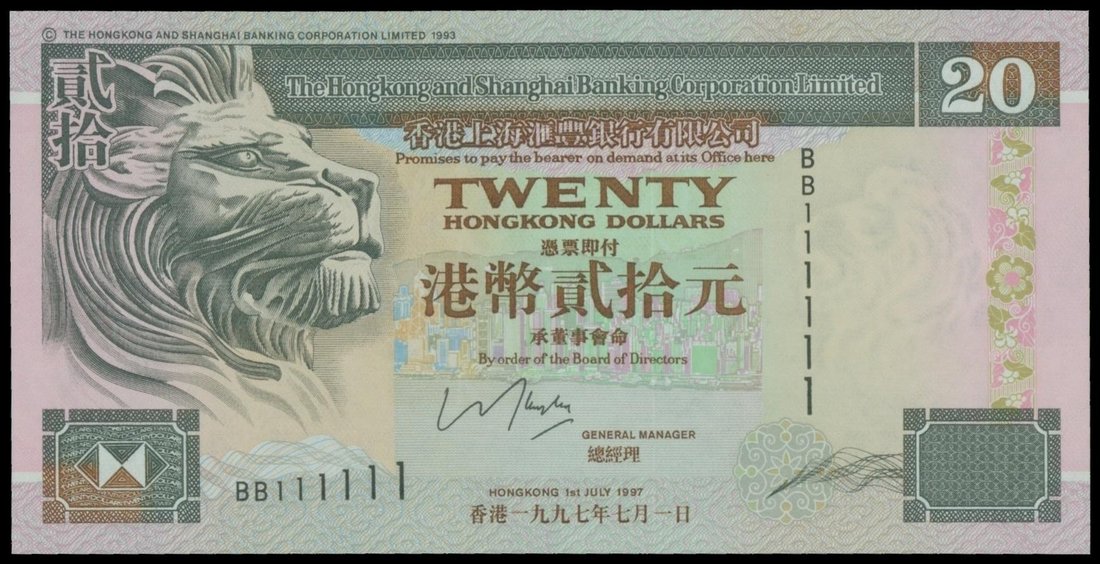 The HongKong and Shanghai Banking Corporation, $20, 1.7.1997, solid serial number BB111111, dark green and multicolour, lion at left, view of Victoria Harbour at centre and lion watermark at right, lions flanking the HSBC building on reverse,