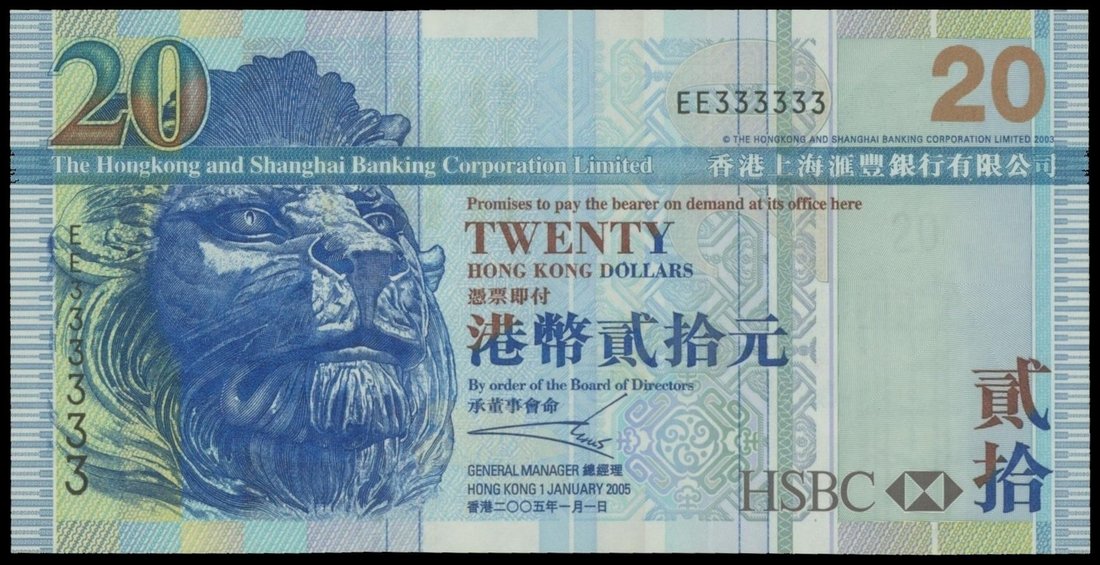 The HongKong and Shanghai Banking Corporation, $20, 1.1.2005, solid serial number EE333333, blue and multicolour, three quarter profile of a lion at left, watermark of the bank building at right, the reverse shows The Peak and at aerial view of Victoria Harbour,