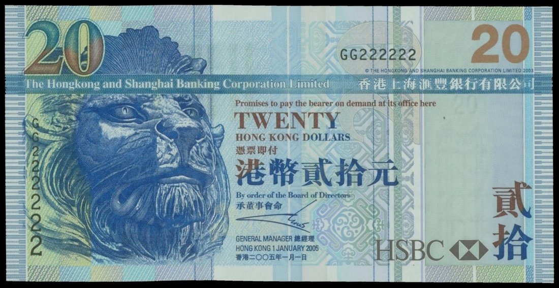 The HongKong and Shanghai Banking Corporation, $20, 1.1.2005, solid serial number GG222222, blue and multicolour, three quarter profile of a lion at left, watermark of the bank building at right, the reverse shows The Peak and at aerial view of Victoria Harbour,