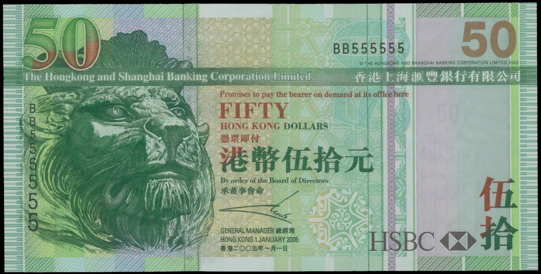The HongKong and Shanghai Banking Corporation, $50, 1.1.2005, solid serial number BB555555, green and multicoloured, three quarter profile of a lion at left, watermark of the bank building at right, the reverse shows Po Lin Temple,