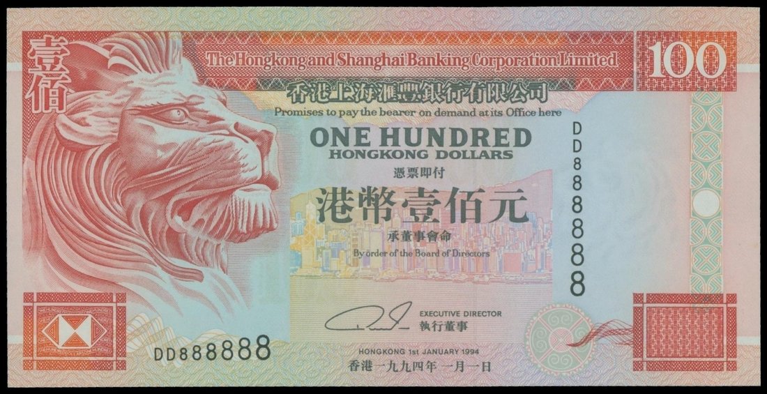 The HongKong and Shanghai Banking Corporation, $100, 1.1.1994, solid serial number DD888888, red and multicolour, lion at left, view of Victoria Harbour at centre and lion watermark at right, lions flanking the HSBC building on reverse,