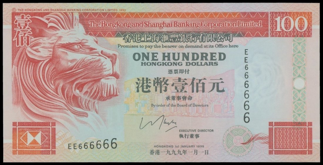 The HongKong and Shanghai Banking Corporation, $100, 1.1.1999, solid serial number EE666666, red and multicolour, lion at left, view of Victoria Harbour at centre and lion watermark at right, lions flanking the HSBC building on reverse,