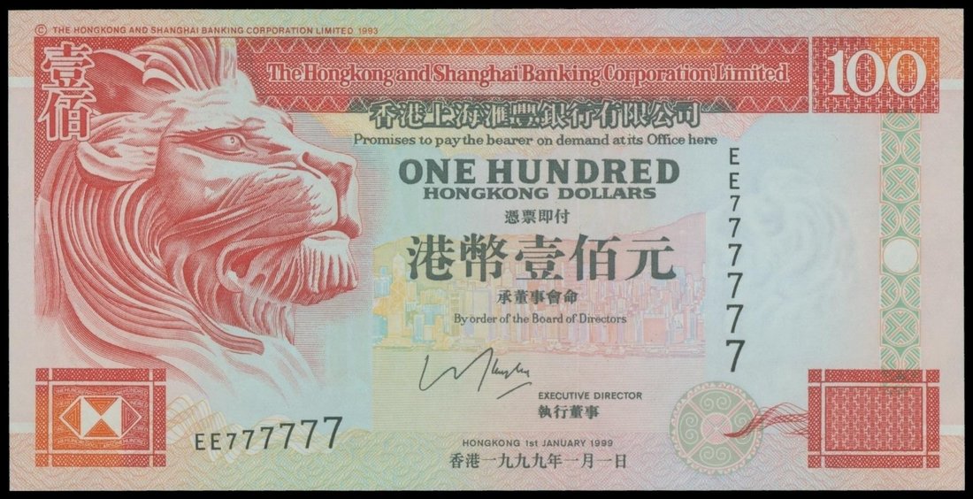 The HongKong and Shanghai Banking Corporation, $100, 1.1.1999, solid serial number EE777777, red and multicolour, lion at left, view of Victoria Harbour at centre and lion watermark at right, lions flanking the HSBC building on reverse,
