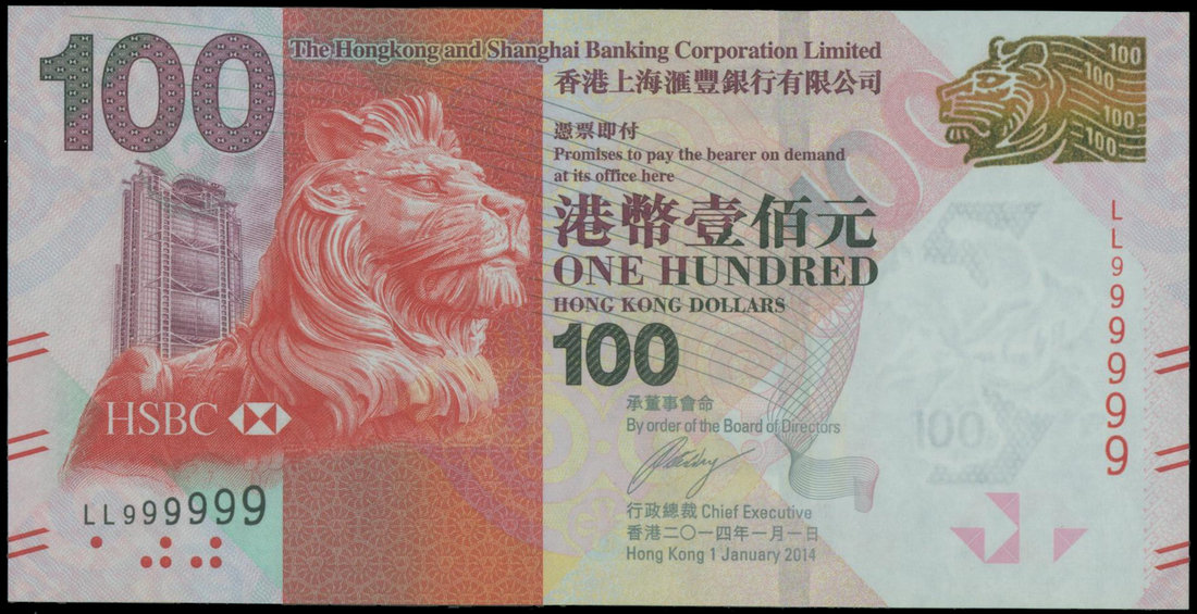 The HongKong and Shanghai Banking Corporation, $100, 1.1.2014, solid serial number LL999999, red on multicolour, lion and HSBC building at left, watermark area at right, the reverse shows a muscial playing on HKSAR Establishment Day,
