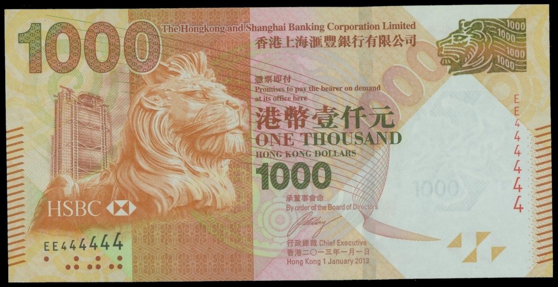 The HongKong and Shanghai Banking Corporation, $1000, 1.1.2013, solid serial number EE444444, yellow-orange and multicoloured, lion and HSBC building at left, reverse orange and green, dragon boat racing scene at right,