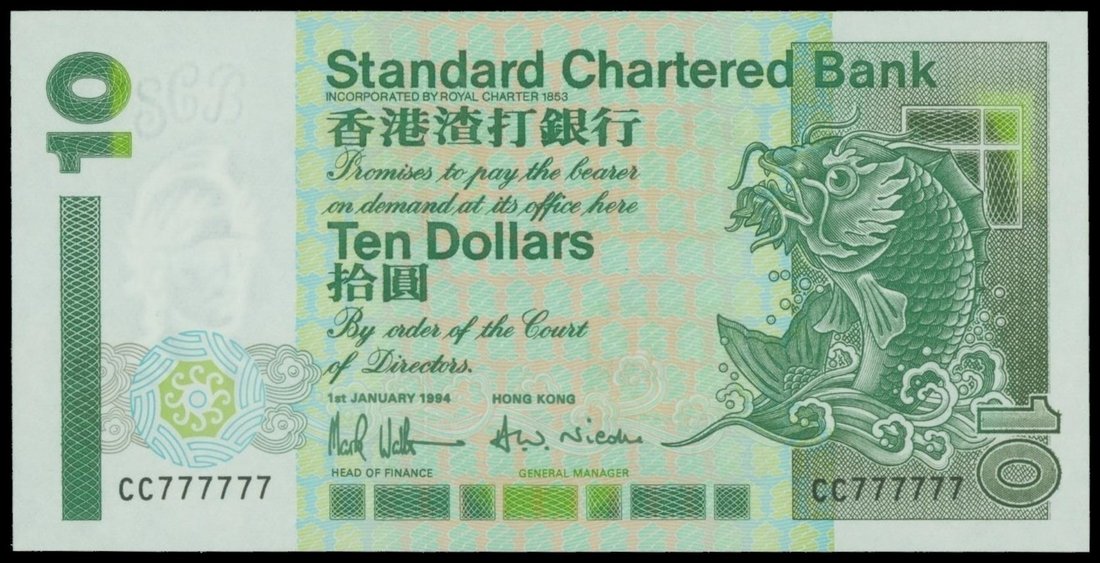 The Chartered Bank, $10, 1.1.1994, solid serial number CC777777, green and multicolour, mythical carp at right, watermark of a helmeted warrior at left,