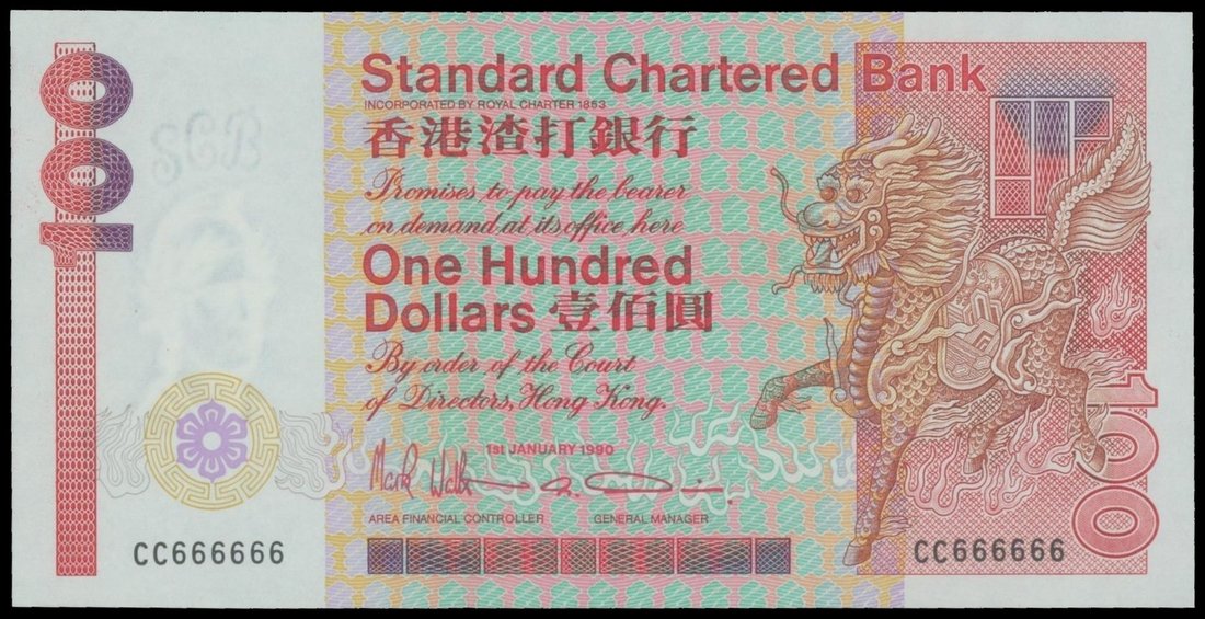 The Chartered Bank, $100, 1.1.1991, solid serial number CC666666, red and multicoloured, Qilin at right, watermark of helmeted warrior at left, reverse red and green, bauhinia flower at centre, bank building at left,