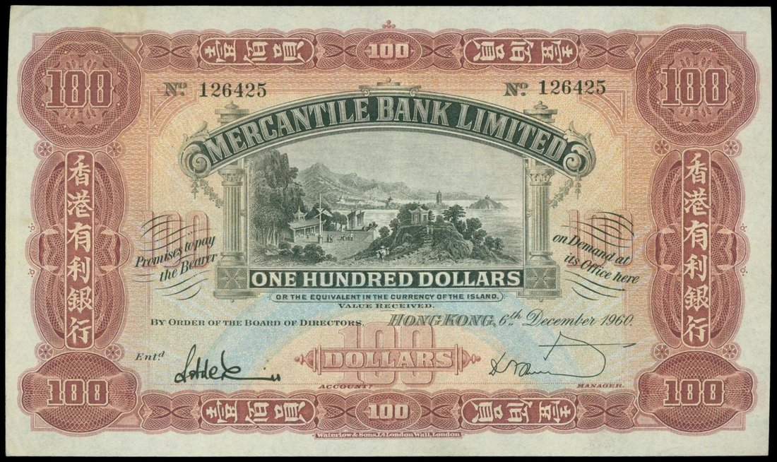 Mercantile Bank Limited, $100, 6.12.1960, serial number 126425, black and blue on red, houses by water's edge at centre, reverse red and black, Mercury at centre,