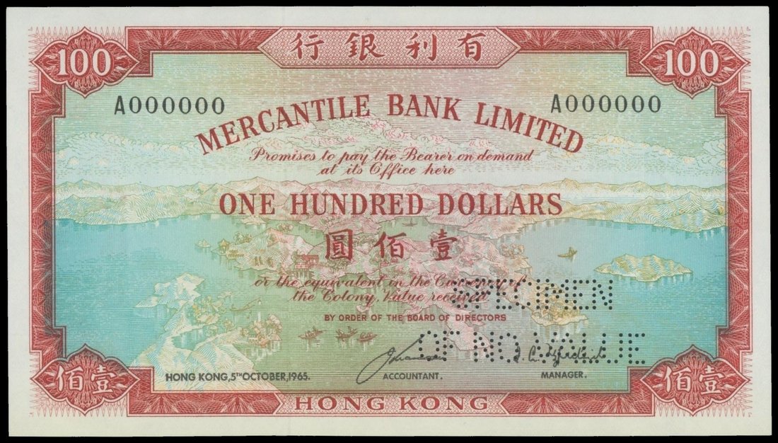 Mercantile Bank Limited, specimen $100, 5 Oct 1965, black serial A000000, red on multicolour, landscape view of Hong Kong Island at centre, perforations at bottom right, reverse red on multicolour, Britannia at centre,