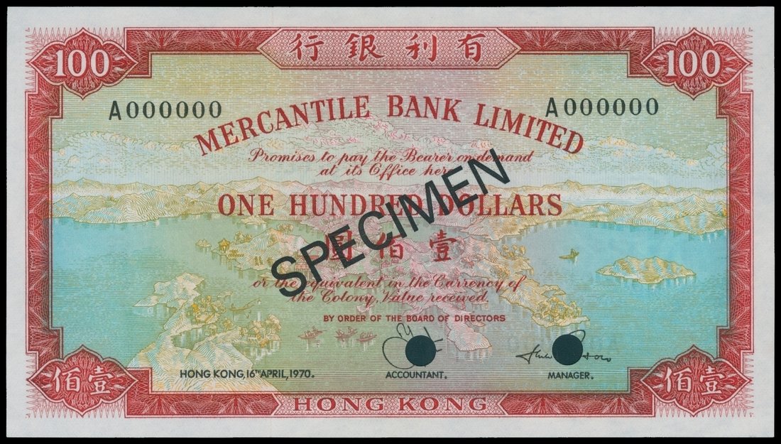 Mercantile Bank Limited, specimen $100, 16 April 1970, serial number A 000000, red and multicoloured, view of Hong Kong at centre, printed signature low centre , reverse red, maiden and allegorical symbols at centre, value at each corner