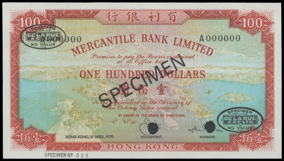 Mercantile Bank Limited, $100, specimen, 16.4.1970, serial number A000000, red, green and blue, view of Hong Kong Island at centre, reverse red and yellow, Britannia holding at spear at centre, black SPECIMEN’overprinted at centre,