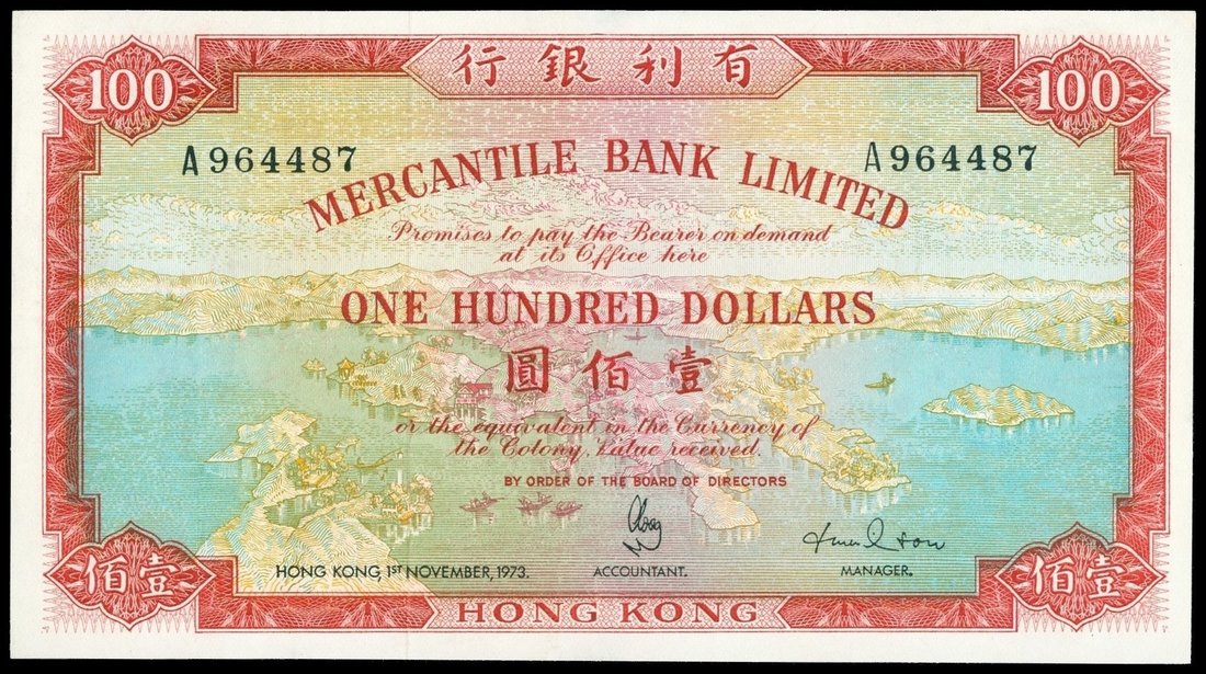 Mercantile Bank, $100, 1.11.1973, serial number A964487, red, green and blue, view of Hong Kong Island at centre, reverse red and yellow, Britannia holding at spear at centre,